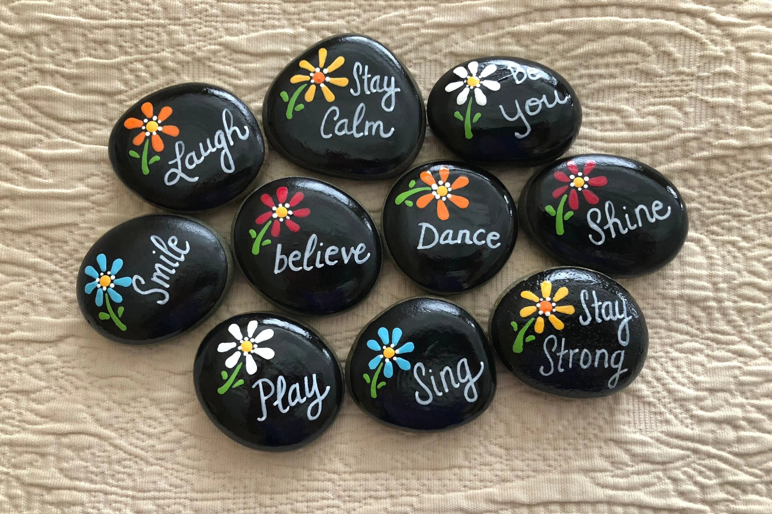 In this project, we will paint a set of 10 pocket rocks with daisies and “words of wisdom.”